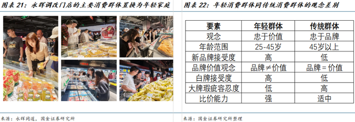 客群置换是永辉调改关键,也是导致不同门店调改后客流表现差异的主要原因之一。过去永辉超市的客群年龄相对较高,收入水平和消费意愿更低,对于新品牌/自有品牌的接受度较低,客单价也相对较低。目前永辉优先调改的门店,以及调改后表现更好的门店大多位于当地年轻&较高收入社区附近,年轻一代人逐渐“从忠于品牌的时代向产品价值时代转换”,不再迷信大牌而是关注产品本身是永辉目标客群的特点,年轻父母推着婴儿车选购生鲜成为店内常态,年轻家庭客群占比达五成以上,进一步推动了门店客单价的明显提升。