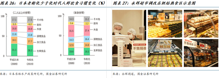 加工食品在胖改中得到明显重视,烘焙熟食区成为仅次于生鲜蔬菜的引流品类,这顺应了中国老龄化、少子化的长期趋势。随着中国老龄化率提升和少子化趋势的发展,加工食品(烘焙、熟食)在人们日常生活中的重要性将得到明显提升,而这部分需求由于即时性强(电商无法及时供给),单次消费金额低(外卖运费敏感性高),无论是电商还是外卖都无法替代线下超市的独特供给作用。