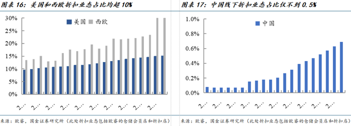 零售龙头公司在后消费时代的成长速度高于大部分传统消费品龙头公司,成长空间主要来自于新型零售模式基础上,依靠效率提升,价格降低两大手段实现的行业集中度提升。从美日经验来看,过去30年在不考虑出海贡献前提下,日本折扣零售公司唐吉诃德、两家药妆零售店Weilcia和Kusuri均实现了20年左右年化超20%的市值增长率,远超其他传统消费品龙头低个位数的增长率水平。而同期美国也涌现了数十家线下零售巨头公司,纯依赖内需都实现了20年左右年化超15%的市值增长率,而同期宝洁、百事可乐、麦当劳等传统消费龙头公司剔除掉出海贡献后,长期市值增长率水平仅为6%-8%。