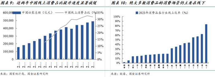 尽管中国电商高度发达,但线下消费占比仍达70%,线下消费仍旧是占大头的刚性需求。近两年线上消费占比提升速度已明显放缓,中国线上线下消费占比基本稳固。在电商发展成熟多年后,我们发现大量细分消费品类的线下占比仍旧很高,这是由于商品本身属性和消费者天然消费习惯所决定。鲜食和软饮料线下占比超过90%,调味品、酒精饮料、零食、乳制品线下占比均超80%,线上化率较高的纸巾、服装鞋类、美容产品也有至少50%的消费发生在线下。