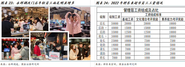 越往下线城市,员工收入提升激励程度越高,服务差异化优势或越明显,但不宜过度夸大服务在精选型零售中的影响。以2022年胖东来超市员工工资为例,处长及以下员工工资均低于1万元,这样的工资水平在一线城市的吸引力低于下线城市,这也导致一线员工年轻化比例低于下线城市,对服务效率产生一定影响。但是越往下线城市,激励程度越明显,因为大零售行业的员工工资平均水平并不高,一旦实现正向循环,精选型零售企业可以在大部分下线城市招到行业最优质的员工。但我们认为精选型零售的核心仍旧是产品,不宜过于放大或神化服务的影响力,服务可以成为优质产品的补充剂,而优质服务的形成相当程度依赖于制度的建设。