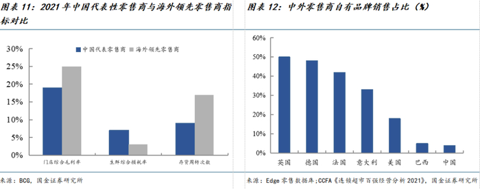随着传统商超的式微和退出,正为新型优质零售商留出了广大的发展空间。传统商超模式导致的负向螺旋,导致消费者既无法买到足够具备性价比的产品,也无法买到独居特色的差异化商品,这类基本的需求将被新型零售商获取,从而推动行业集中度的进一步提升。从海外比较来看,目前中国线下零售商还依靠传统的通道式业务,体现在商品端是更高的终端价格,而存货周转效率(9%)远低于海外领先零售商(17%),不少企业面临亏损。此外中国零售商的自有产品占比远低于欧美的成熟零售市场,对于大牌的高依赖度带来的是对商品议价权的缺失。