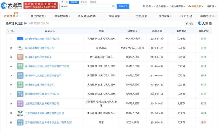 据天眼查数据,张雪峰(原名张子彪)的名下关联企业10家,业务涵盖教育咨询、图书出版、研学旅行等领域。