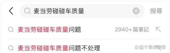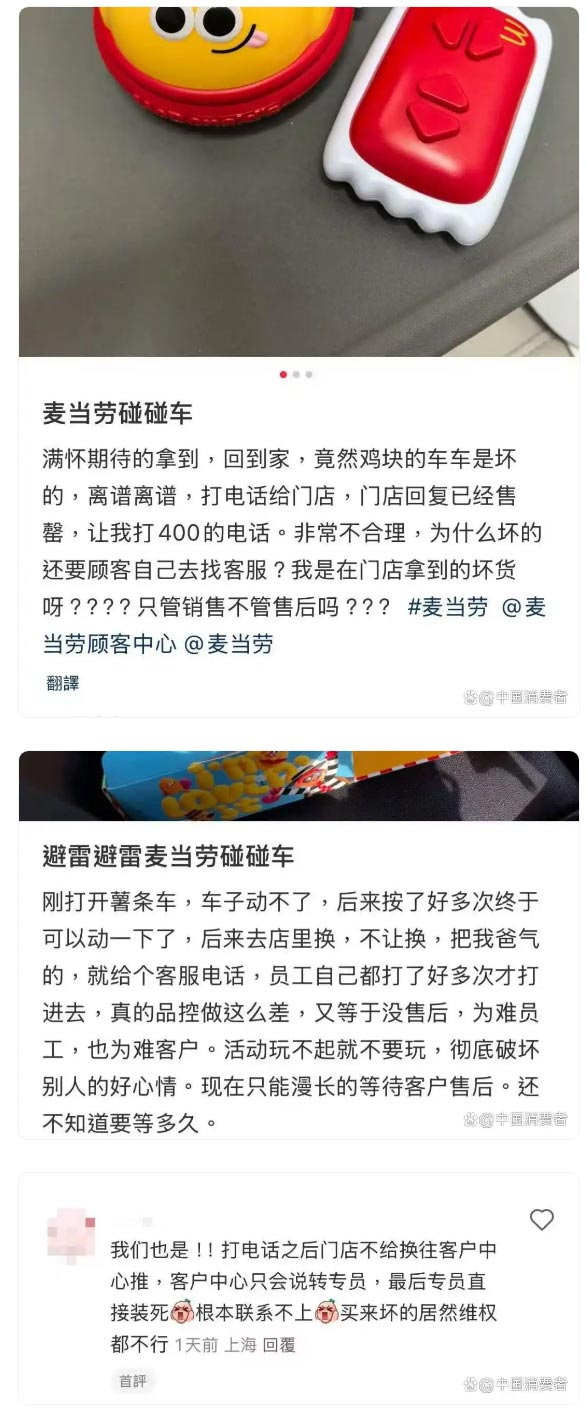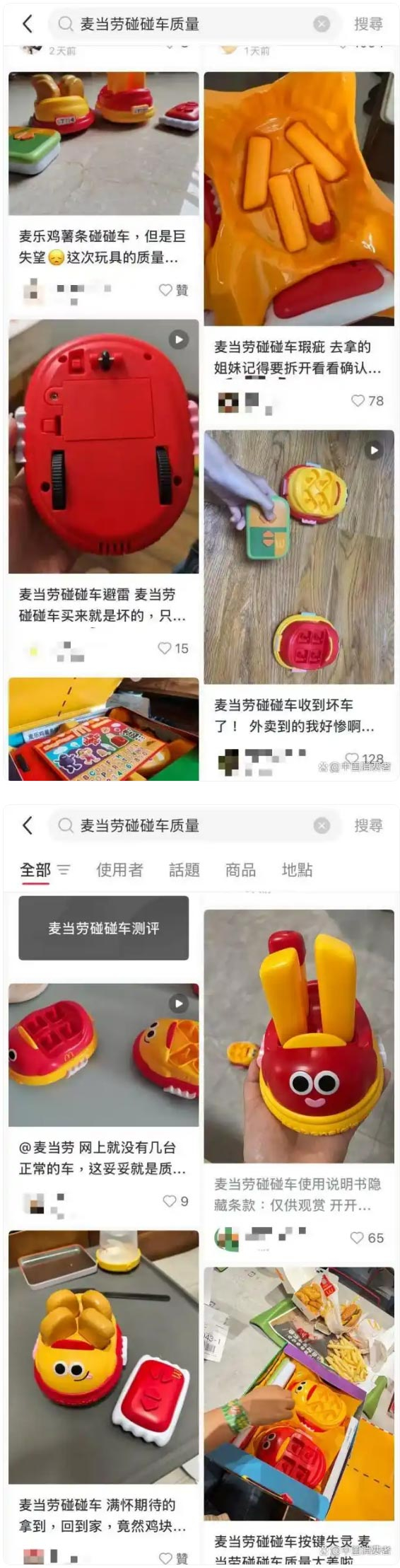 记者调查发现,这款玩具并非直接赠送,而是需要消费者在消费满29.9元后,额外支付68元才能换购。在社交平台小红书上,有关“麦当劳”“碰碰车”“质量”等关键词的帖子已近3000条,多个点赞量高的帖子集中反映了两大问题:其一,该玩具产品质量问题频发;其二,维权渠道不畅,消费者权益难以保障。