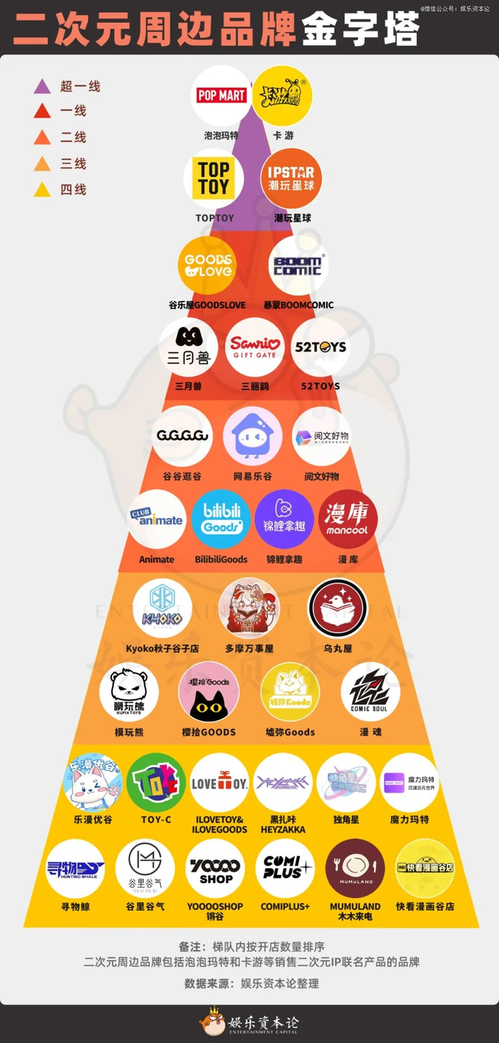 娱乐资本论综合店铺数量、覆盖城市、商圈和消费水平等各项数据,整理了一份二次元周边品牌梯队。
