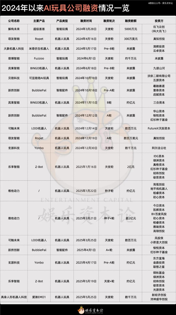把时间轴进一步拉长,2024年以来已经有12家涉及AI玩具业务的公司拿到融资。Haivivi跃然创新甚至在这一年半的时间里就拿到了三轮融资。两相对比之下,二次元周边市场虽然热度不减,但资本还是给出了他们的选择。