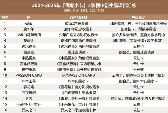 比如芒果TV的《名侦探学院》《披荆斩棘》《女子推理社》等真人秀节目,都有多种类型的卡片产品问世;不少剧集IP也在尝试用明星小卡拓展作品传播维度,同时撬动更多的“IP附加值”。