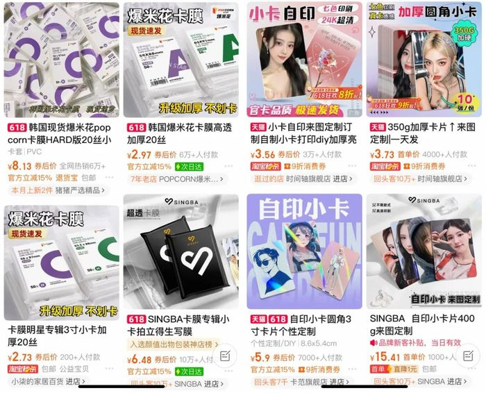 而在明星本人都在呼吁大家“自印”(个人或非官方机构自行印刷制作小卡等周边的行为)、不要“头铁”的状况下,目前明星小卡的自印业务也很热门。在淘宝一家店铺,根据亮膜、哑膜、镭射膜,以及不同尺寸和材质的区分,10张小卡最便宜才不到4块钱。不过,考虑到小卡这类产品极低的生产成本,凭借超高销量也足以让商家赚得盆满钵满。