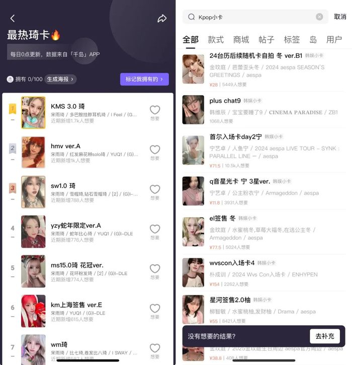 无独有偶,在有百万KPOP粉丝聚集的潮玩社交平台千岛以及二手交易类平台转转上,同样充斥着大量喜欢明星小卡的用户,他们除了在平台上挂售产品,还通过发帖与同好进行交流互动。比如千岛中,一款首尔入场卡day2宁的韩娱小卡,成交均价为71.5元,有超过1万人想要。