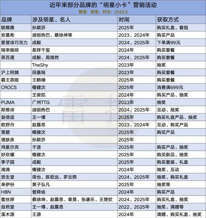 例如,雷报统计了近年来部分品牌的国内营销活动,能够看到企业在明星小卡营销方面可谓不遗余力。从整体布局特点来看,"前瞻布局"与"高频渗透"是品牌小卡营销的两大核心特征——部分企业早在2022年便率先试水这一形式,而更多品牌则通过持续推出明星小卡周边,使其成为品牌营销活动的常态化配置。