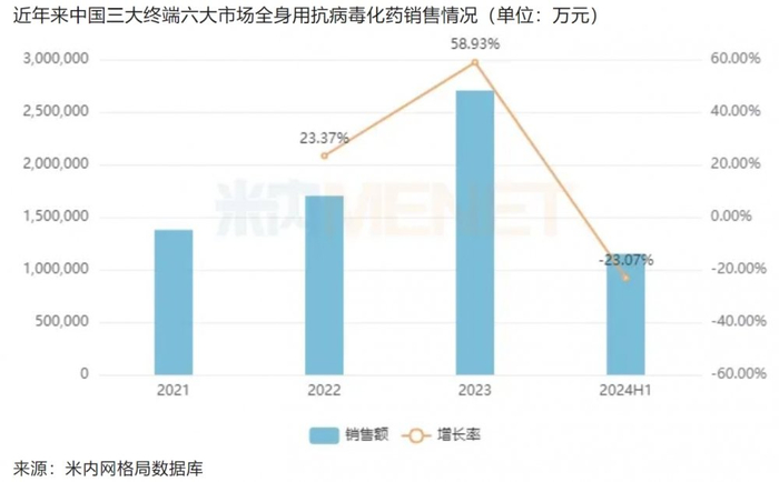 中国丙肝药物市场在DAA引入后快速发展。米内网数据显示,2023年中国三大终端六大市场全身用抗病毒化药销售额超过270亿元,其中丙肝药物占据重要份额,同比增长约59%,2024上半年有所回落。从一级集团排名看,广东东阳光药业近年来稳居榜首,市场份额均超过20%。