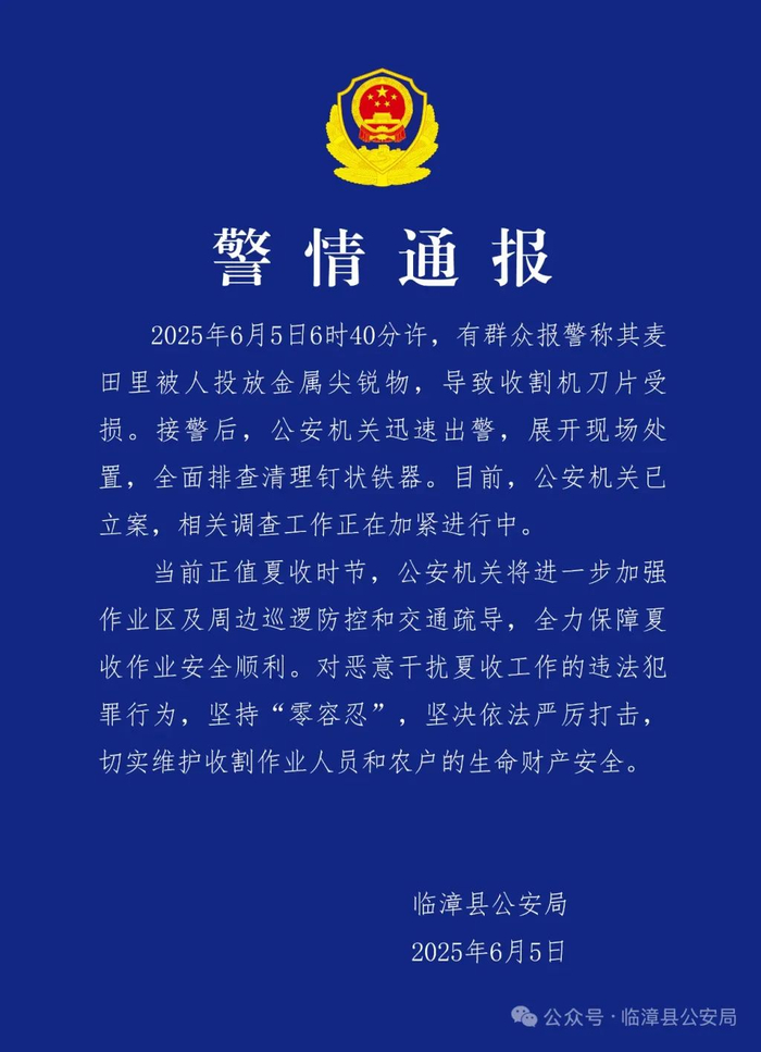 通报称,2025年6月5日6时40分许,有群众报警称其麦田里被人投放金属尖锐物,导致收割机刀片受损。接警后,公安机关迅速出警,展开现场处置,全面排查清理钉状铁器。目前,公安机关已立案,相关调查工作正在加紧进行中。