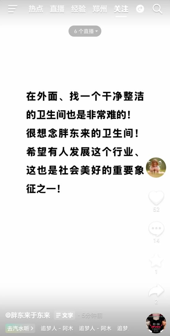 “在外面找个干净厕所太难了,真想胖东来的卫生间!”6月6日,于东来在川藏线旅途中,通过其个人抖音账号发出此番感慨。他同时呼吁:“希望有人发展这个行业,这也是社会美好的重要象征之一!”