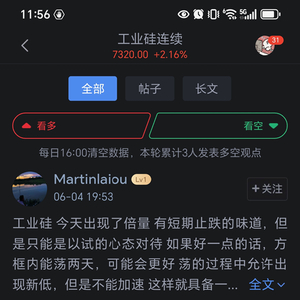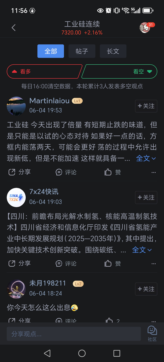 在价格跌破7000元大关后,新浪财经APP期货社区瞬间热闹起来。投资者们纷纷发表自己的看法,讨论区充满了各种观点和预测。有的投资者认为,价格的下跌是短期调整,长期来看工业硅的需求依然强劲;有的则担心宏观经济形势的不确定性会进一步打压价格。社区内的这种热烈讨论,不仅让投资者能够从不同角度思考问题,还凝聚了市场共识。许多投资者在讨论中找到了自己的交易方向,有的选择在价格下跌时逢低买入,有的则在反弹时果断获利了结。