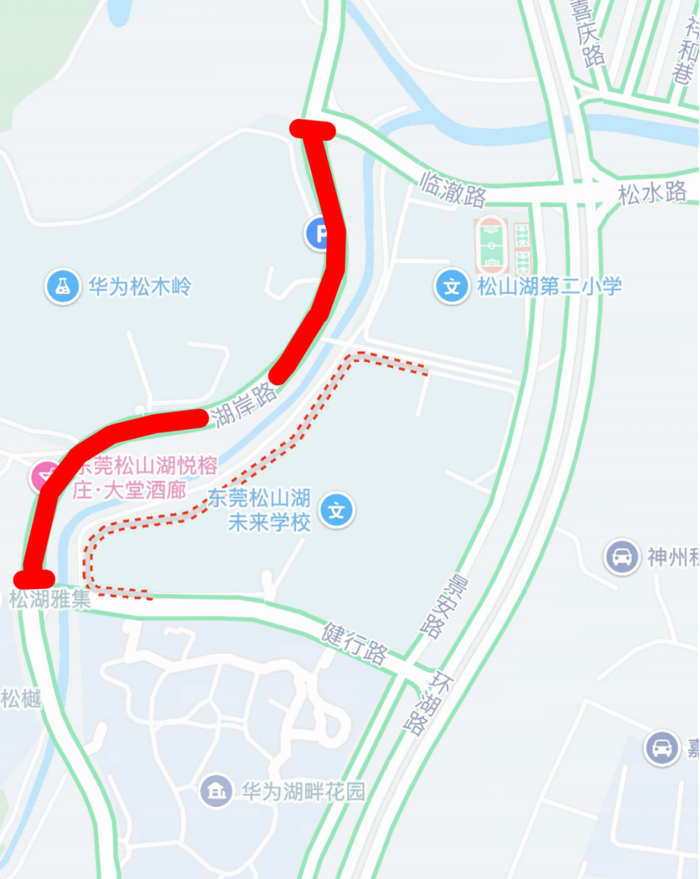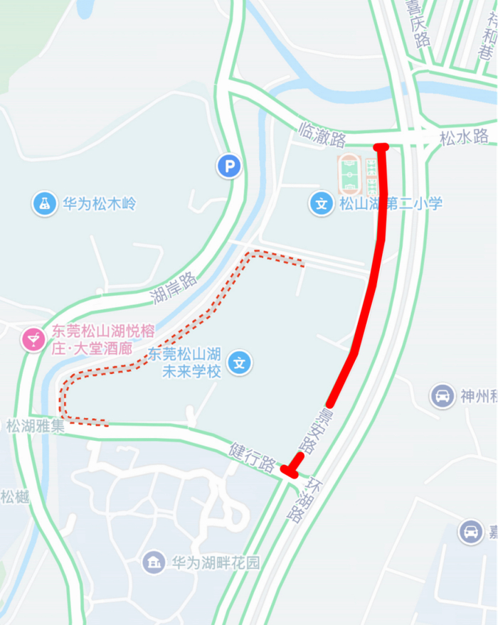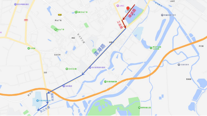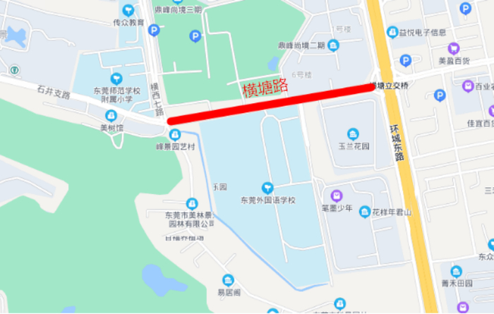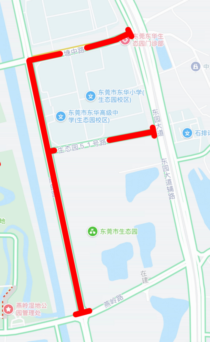 (二)三塘路、莞潢北路学校等周边路段(红色路段)禁鸣喇叭,慢速通行。