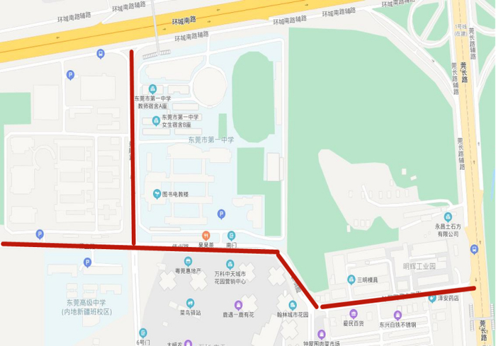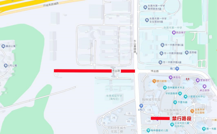 伟业路东莞高级中学对出路段禁止所有社会车辆驶入、禁鸣喇叭和停放车辆。