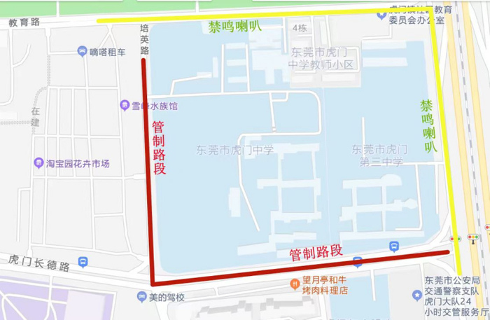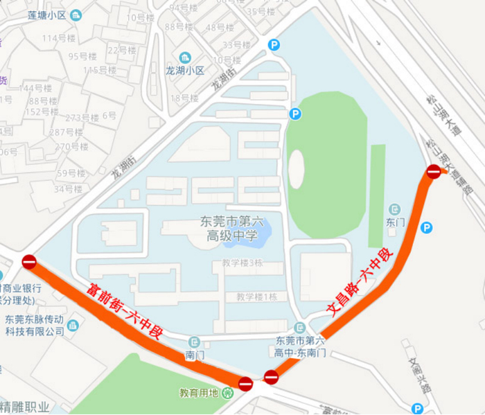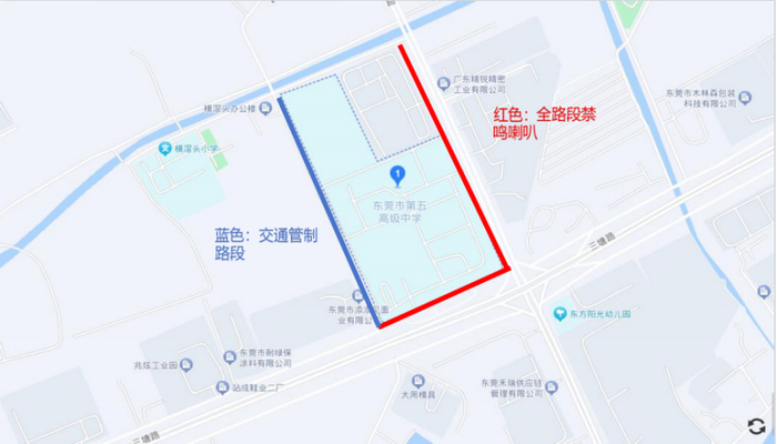 东莞市第六高级中学周边路段(富前街六中路段、文昌路六中路段)、东莞外国语学校周边路段(横塘路外国语学校路段)禁止机动车驶入、禁鸣喇叭。