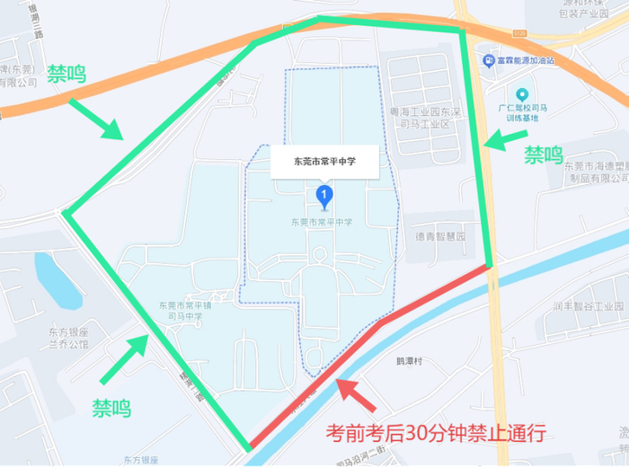(一)东江大道学校路段(东至东深路、西至槎湖二路)禁鸣喇叭,考前30分钟到考试结束后30分钟禁止所有社会车辆进入;