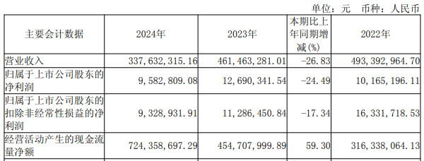 2024年,海泰发展营业收入为3.38亿元,同比下降26.83%;归属于上市公司股东的净利润958.28万元,同比下降24.49%;归属于上市公司股东的扣除非经常性损益的净利润932.89万元,同比下降17.34%;经营活动产生的现金流量净额7.24亿元,同比增长59.30%。