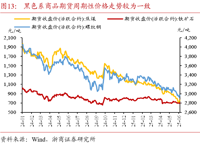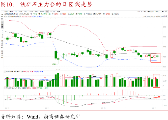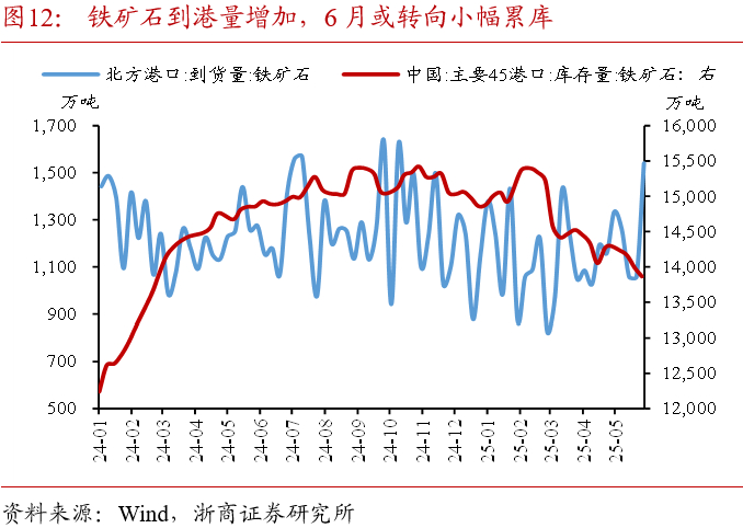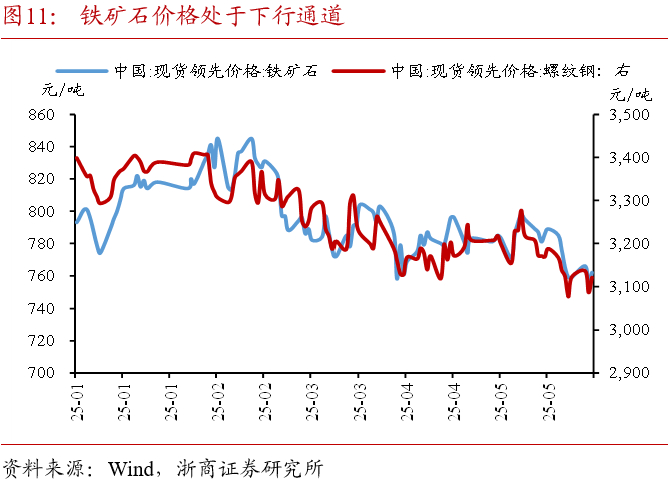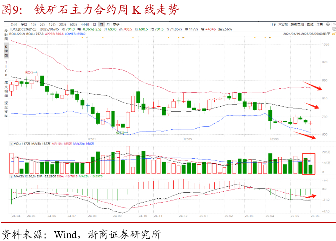 铁矿石供需格局环比弱化,价格同样处于中期下行趋势中。从铁矿石需求端来看,如前文提及,铁水产量本周已开始下行,预计后续受季节性因素影响进一步走低,继而带动铁矿石需求走弱。而从供给端来看,铁矿石到港量环比增加,处于季节性偏高位,6月或从去库存转为小幅累库,供需格局环比有所弱化。铁矿石现货价格方面亦同样处于中期下行趋势中。