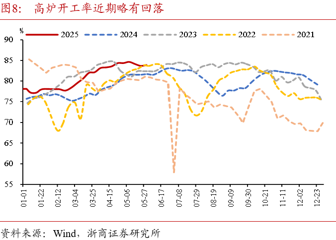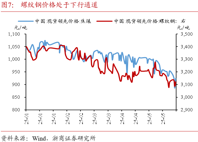 从基本面来看,螺纹钢自身供需暂未出现明显改善,价格也跟随原材料端处于下行通道中。正如前文分析,铁水近期已有减产迹象,随着钢厂长期高负荷运行,且下游需求逐步进入季节性走弱,钢厂或进入季节性检修频繁阶段,带动铁水产量进一步走低。钢材价格主要受原材料焦煤端牵引,而原材料整体供大于求。依据Mysheel市场信息,部分钢企提出焦炭第三轮降价诉求,如唐山市场个别钢厂计划对捣鼓湿熄焦炭价格下调50元/吨、捣鼓干熄焦下调55元/吨;顶装湿熄焦炭价格下调70元/吨、顶装干熄焦下调75元/吨,2025年6月6日零点执行。炼焦煤竞拍成交价下跌为主,流拍率依然较高。从高频数据来看,高炉开工率近期有所回落,同样可以佐证螺纹钢自身供需暂未出现明显改善,螺纹钢现货价格也处于下行通道中。