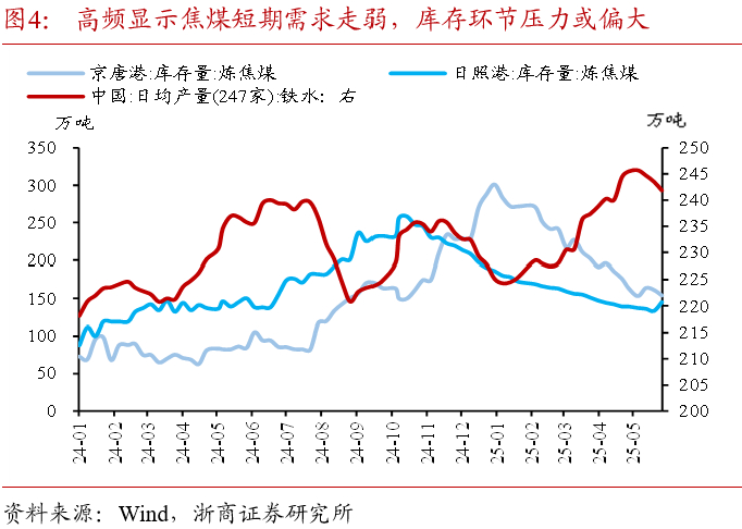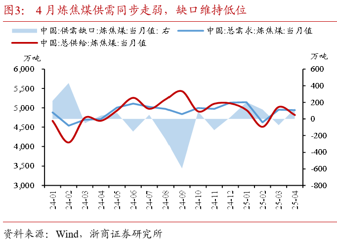 从基本面来看,焦煤作为黑色系产能过剩相对较为严重的品种,短期需求仍旧走弱,供需格局并未明显改善,基本面暂不支持其期货价格走势出现趋势反转。6月4日焦煤主力合约大幅上涨主要是由于一则蒙古将对煤炭出口征收资源税的消息面扰动,但经蒙古国税务总局核实,截至目前,尚未有关于煤炭矿产资源税及出口相关税收变动的官方决议出台。从供需格局来看,焦煤销售不畅导致部分矿山有减产动作,但暂未出现大面积减产,4月炼焦煤供需同步走弱,供需缺口维持低位。从5月高频数据来看,需求端铁水产量下滑,企业原料补库意愿相对偏弱,因此焦煤短期需求仍旧走弱,库存环节或压力偏大。