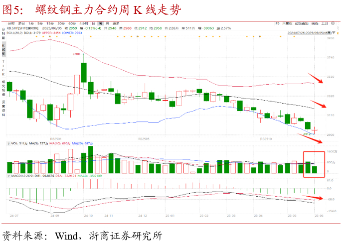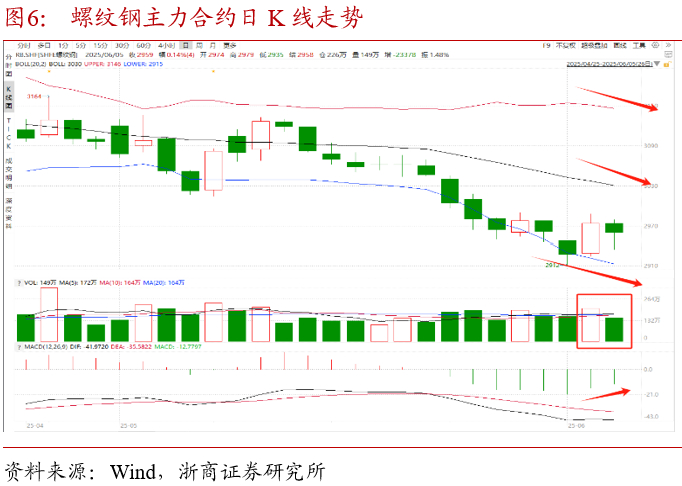 从技术面来看,螺纹钢期货主力合约反弹信号弱于焦煤。从周线维度来看,螺纹钢主力合约与焦煤品种均出现布林线3条轨线向下且价格沿着布林线下轨运行的偏空趋势,但螺纹钢品种短期反弹信号更弱,主要体现在本次反弹并未推动周线级别成交放量,且周线级别MACD绿色柱线也并未缩短,仍旧延续偏空趋势。从日K线来看近两个交易日特征与焦煤品种较为一致,但6月5日并未像焦煤品种走出“十字星”形态,显示空方力量明显占优,本轮反弹力度偏弱。
