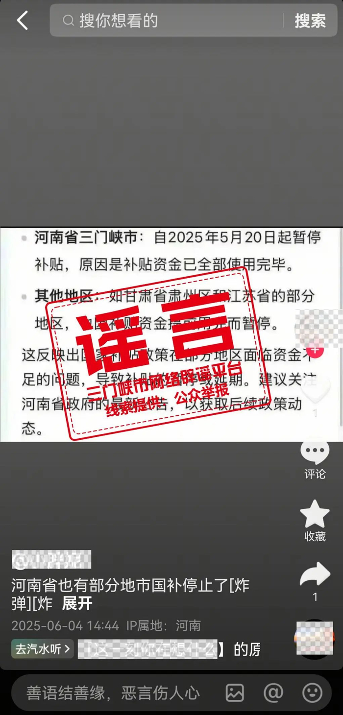 6月4日,三门峡市网信办接网民举报,网络用户“@小胖妮”在某平台发布短视频称:“国补快要停了,河南地区已经到三门峡了。三门峡自2025年5月20日起暂停补贴,原因是补贴资金已全部使用完毕。”该信息引发社会关注。
