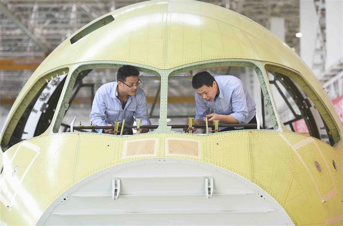 2017年4月28日,在四川成都,中航成飞民用飞机有限责任公司C919国产大飞机机头生产线工人在进行C919驾驶舱风挡装配操作。 新华社记者 刘坤 摄