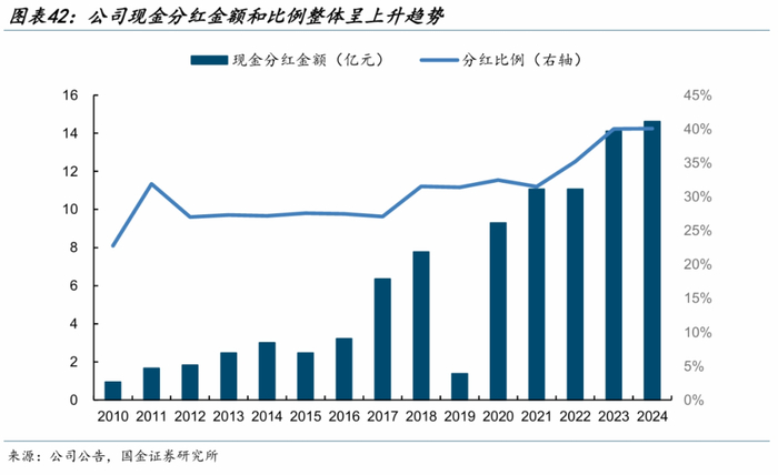 分红稳步提升,2010年公司现金分红占归母净利比例为22.77%;2024年,公司现金分红金额提升至14.61亿元,占归母净利比例达40.07%,每10 股派发现金红利8.65元(含税),按照当前股价计算,对应股息率约为3%。