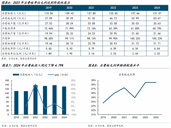 近年来石膏板单位盈利略有下滑、相对稳定。2019-2024年,石膏板收入复合增速3.56%。2024年,石膏板收入为131.07亿元,同比下降4.79%,主因市场竞争导致价格下降。石膏板均价为6.04元/平米,同比下降0.30元/平米;单位毛利2.32元/平米,同比下降0.11元/平米(成本同步下降)。