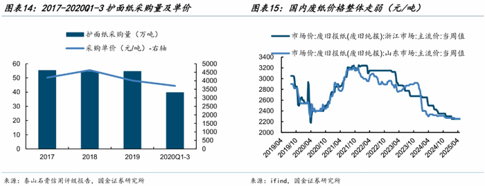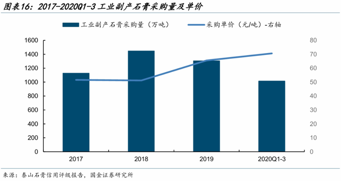 公司在护面纸采购具备优势:一方面采购量较大,对上游护面纸供应商拥有一定的议价能力。另一方面,公司自备造纸厂“泰和纸业”年产石膏板护面纸60万吨,2019年公司采购护面纸54.60万吨(含自产),对应每平米用量约0.3kg,据此测算,泰和纸业年产能对应满足石膏板需求约20亿平米,可以保障泰山石膏大部分的自用供应。
