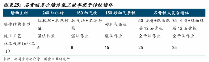 施工效率:传统墙面施工工艺多为湿法,以红机砖+水泥砂浆为例,施工效率仅为6㎡/工日,而石膏板复合墙体施工效率可达25㎡/工日,且对工艺要求低,施工工程中产生的建筑垃圾也较少。