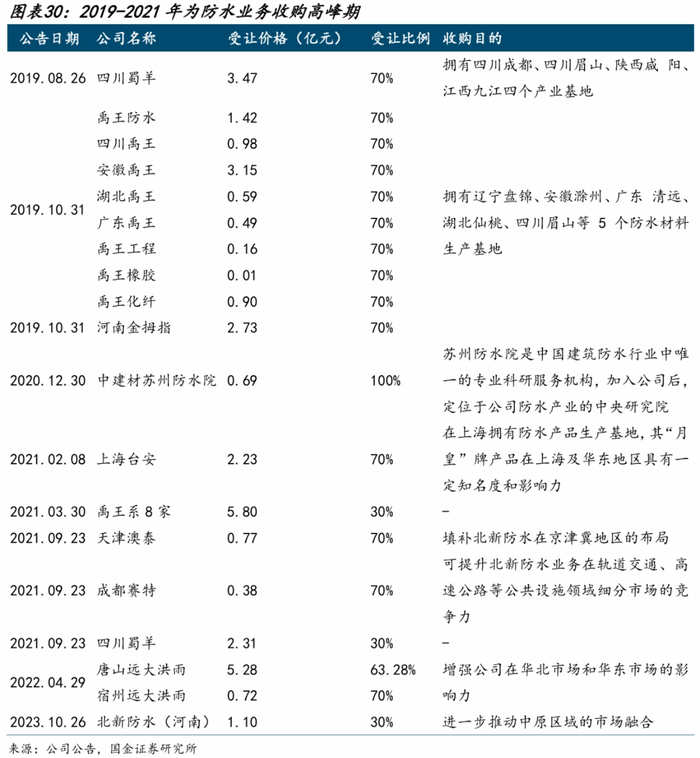 2021年:2月联合重组上海台安,该标的在上海拥有防水产品生产基地,其“月皇”牌产品在上海及华东地区具有一定知名度和影响力;3月完成禹王系8家剩余股权收购;9月联合重组天津澳泰,填补北新防水在京津冀地区的布局;9月联合重组成都赛特,提升北新防水业务在轨道交通、高速公路等公共设施领域细分市场的竞争力;9月完成四川蜀羊剩余股权收购。