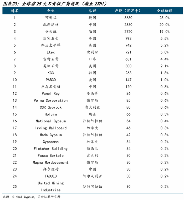 北新建材,石膏板业务在国内市占率超过60%,全球份额达到20%;