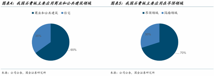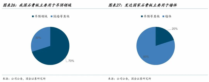 石膏板行业需求和房屋竣工高度相关。石膏板下游主要应用在写字楼、酒店、宾馆、体育场馆、工业厂房以及住宅等商业和公共建筑领域,占比约65%,住宅领域占比约35%。我国石膏板约70%集中于吊顶领域,隔墙应用少,而参照美国、日本等发达国家,石膏板有约80%应用于墙体建设。