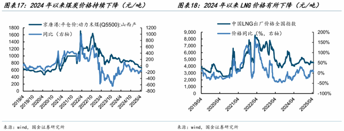 燃料方面,2019年泰山石膏板单位标准煤耗约0.55kg/平方米,电耗约0.35千瓦时/平方米,公司通过精益管理、提高工艺等手段持续降低单位能耗,如2022年龙牌通过对热风炉系统工艺调整、降低蒸发量等,使煤耗降低0.01kg/㎡。2024年石膏板单位煤耗、电耗继续下降。此外,2024年以来煤炭价格持续下降,天然气价格亦有所回落。
