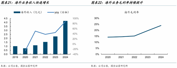 公司在海外聚焦东南亚、中亚、中东、欧洲和环地中海四大区域,海外业务收入和利润快速增长,2019-2024年海外收入从1.00亿元增长至4.17亿元,对应复合增速33.06%;2024年海外业务毛利率23.91%,同比增长4.29pct。根据公司公众号,2025Q1国际化业务收入、净利润同比分别增长73.00%、143.08%。