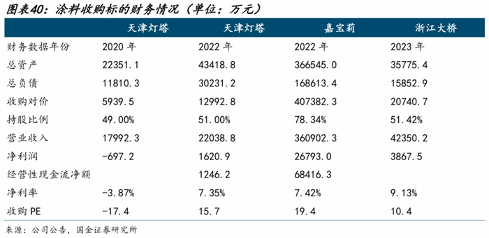 2023年,完成灯塔涂料51%股权的受让,持有灯塔涂料100%股权,建成灯塔涂料天津南港5万吨工业涂料、2万吨树脂生产基地,补强工业涂料。同时,联合重组嘉宝莉;
