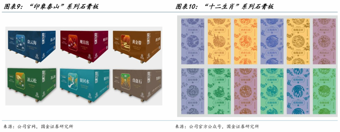 (3)品类上:为拓展家装渠道,泰山推出“泰山金砖九项全能高端石膏板”;联名世界顶级时尚设计品牌,推出伊维娜然系列天然高基板;充分发掘泰山的自然文化,推出印象“泰山系列”产品;以中国独特的生肖文化和吉祥寓意为灵感,以中国传统剪纸艺术为创意,推出“十二生肖系列”高端石膏板。
