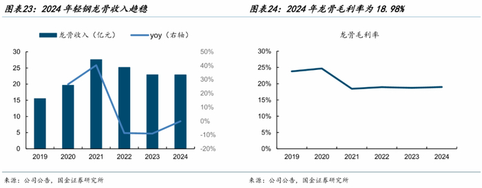 公司的石膏板:龙骨配套率仍然偏低。2021年公司成为全球最大的轻钢龙骨集团,2024年轻钢龙骨产能达到47.13万吨,产能利用率76.13%。2019-2024年轻钢龙骨收入从15.52亿元增长至22.87亿元,复合增速达8.07%。但产量口径,2024年公司轻钢龙骨配套率仅为10.35%。