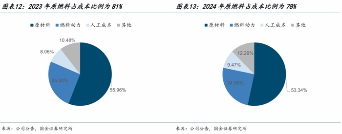 成本方面,原材料和燃料动力占石膏板成本比重近8成。2024年公司石膏板成本构成中,原材料、燃料动力、人工成本、其他占比分别为53.34%、24.90%、9.47%、12.29%。石膏板生产所需原材料主要为工业副产石膏以及护面纸,主要能源为煤炭、电厂蒸汽、天然气和电力。