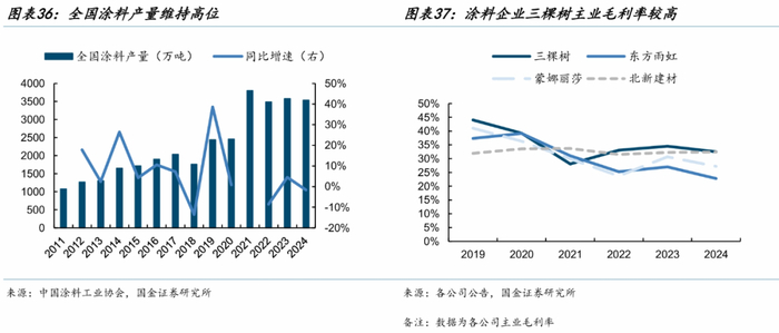 涂料行业市场规模大、消费属性强,属于建材优质赛道。根据中国涂料工业协会统计,2024年中国涂料行业总产量3534.1万吨,同比下降1.60%;主营业务收入总额4089.03亿元,同比增长1.56%;利润总额262.9亿元,同比增长9.34%。涂料行业盈利溢价能力强,例如2024年三棵树(精细化工业务)、东方雨虹(防水卷材业务)、蒙娜丽莎(瓷质有釉砖业务)、北新建材(轻质建材业务)毛利率分别为32.51%、22.79%、27.18%、32.41%。