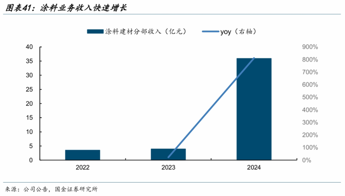 建筑涂料方面,2023年12月29日,公司公告联合重组嘉宝莉,收购前公司涂料业务年产能10.3万吨,且区域主要集中在华北,收购后涂料产能将提升至130万吨以上,产能布局由华北地区扩展至全国,建筑涂料业务将跃居国内行业领先地位。