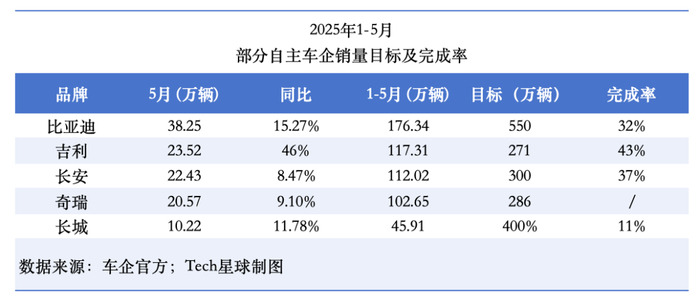 此外,长安汽车全年目标为300万辆,截至5月完成37%,长城汽车目标为400万辆,前5个月仅达成11.48%。