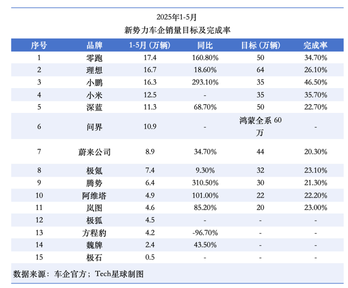 紧随其后的是小米汽车,前5个月累计销量为12.5万辆。按照全年销量目标35万辆来算,小米汽车目标完成率为35.7%。
