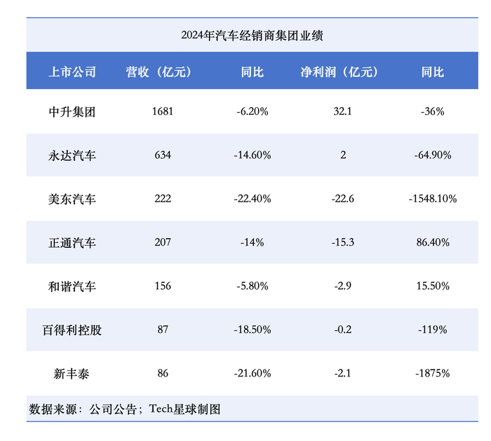 头部4S集团的财务数据能直观地展现惨烈。2024年数据显示,多家上市4S集团营收与净利双降成为“标配”。