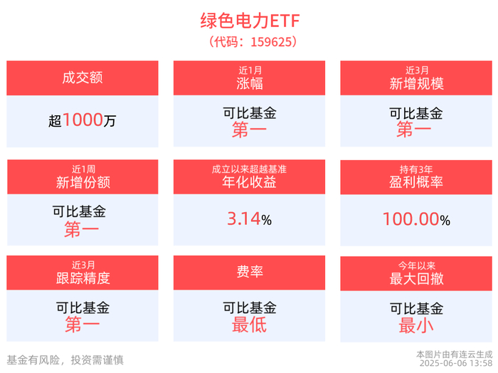 规模方面,绿色电力ETF近3月规模增长6555.78万元,实现显著增长,新增规模位居可比基金第一。份额方面,绿色电力ETF近1周份额增长200.00万份,实现显著增长,新增份额位居可比基金第一。
