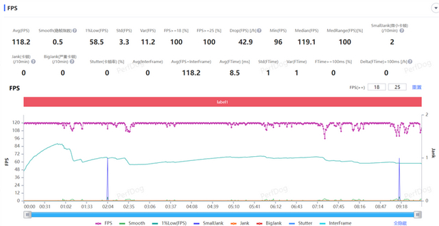 国民手游《王者荣耀》在极高帧率下可开启高清画质,在特效拉满的前提下进行一局5V5的团战测试,帧率可稳定在120FPS基准线上,在多人同时释放大招的时候会出现掉帧现象,最终游戏的平均帧率稳定在了118.2FPS。