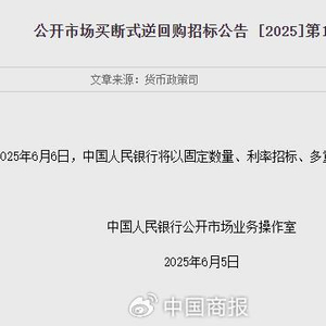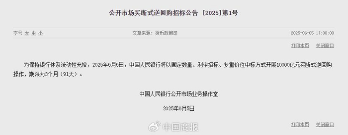 6月5日,中国人民银行(以下简称央行)发布公告称,为保持银行体系流动性充裕,6月6日,央行将以固定数量、利率招标、多重价位中标方式开展10000亿元买断式逆回购操作,期限为3个月(91天)。